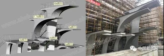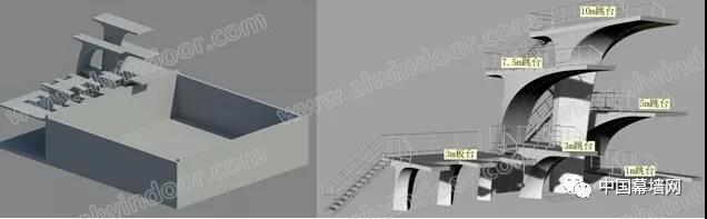 寧波奧體中心游泳館跳水池擁有9個跳臺,其中包括21m跳臺,32.6m板臺,13m跳臺,15m跳臺,17.5m跳臺以及110m跳臺。其中跳臺為空間多曲面清水混凝土空腔結構,空間感強,成型要求高,施工難度大。