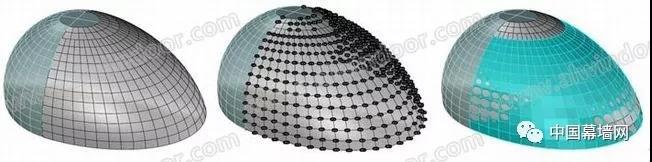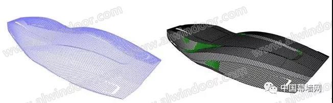 在空間異型項目中,傳統的二維軟件已經無法滿足此類項目的設計,加工,定位,安裝等要求,通過BIM技術的介入,實現三維可視化建模,指導設計出圖。并且在設計階段進行合理優化,有效降低材料加工以及施工難度,縮短施工周期,節約材料以及施工成本。尤其是異型雙曲玻璃幕墻,由于玻璃材質本身特性,給加工施工帶來很大難度,雙曲玻璃板塊加工成本高昂,成品率低,加工精度誤差大,運輸,安裝成本高。并且與板塊相關的所有鋁合金輔材都需要特殊加工。綜合上述所有因素,在雙曲幕墻設計階段就需要對幕墻進行合理優化,降低施工難度,節約材料成本,縮短施工周期,提高施工質量。寧波北侖中國港口博物館A穹頂,該穹頂面積1411㎡。包含雙曲面板415塊,796㎡;單曲面板162塊,615㎡。對原模型進行翹曲只分析,控制翹曲值范圍,通過平面擬合雙曲面的方式有效降低加工施工難度,節約材料成本與施工成本。